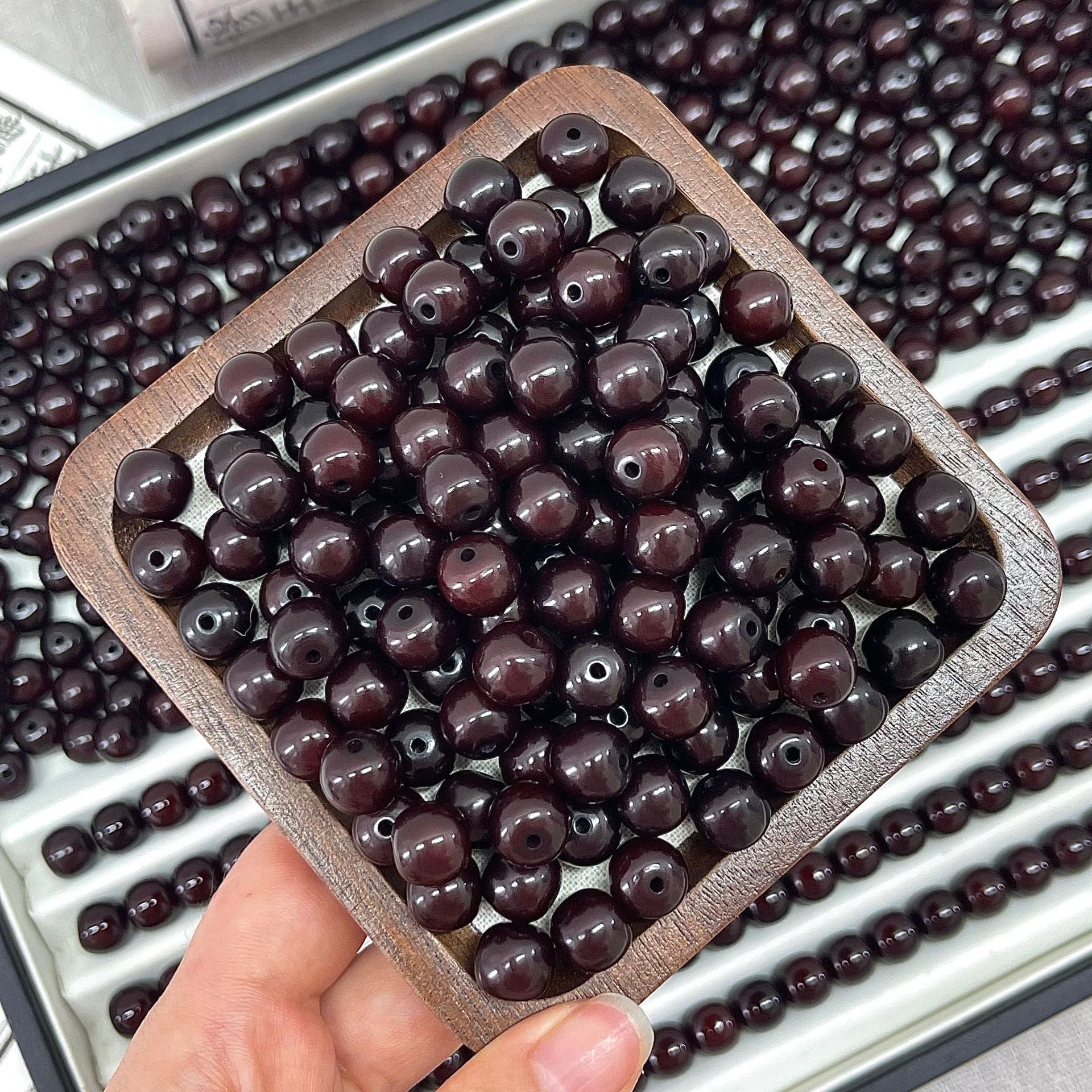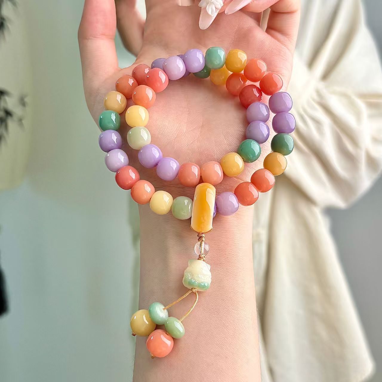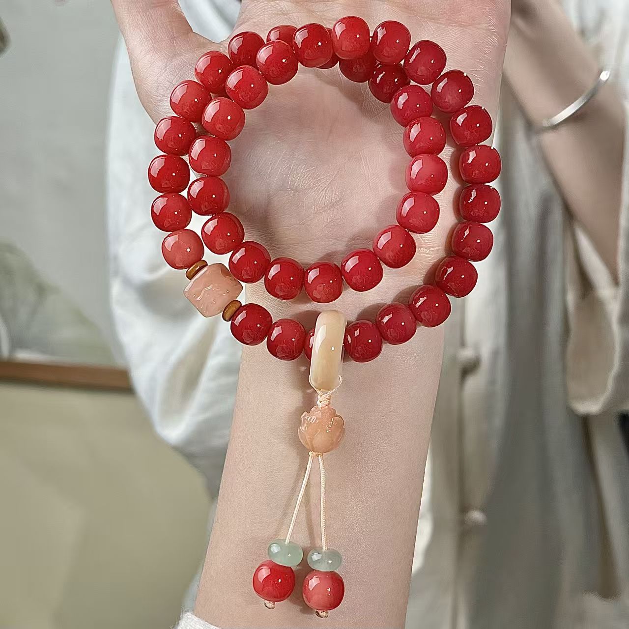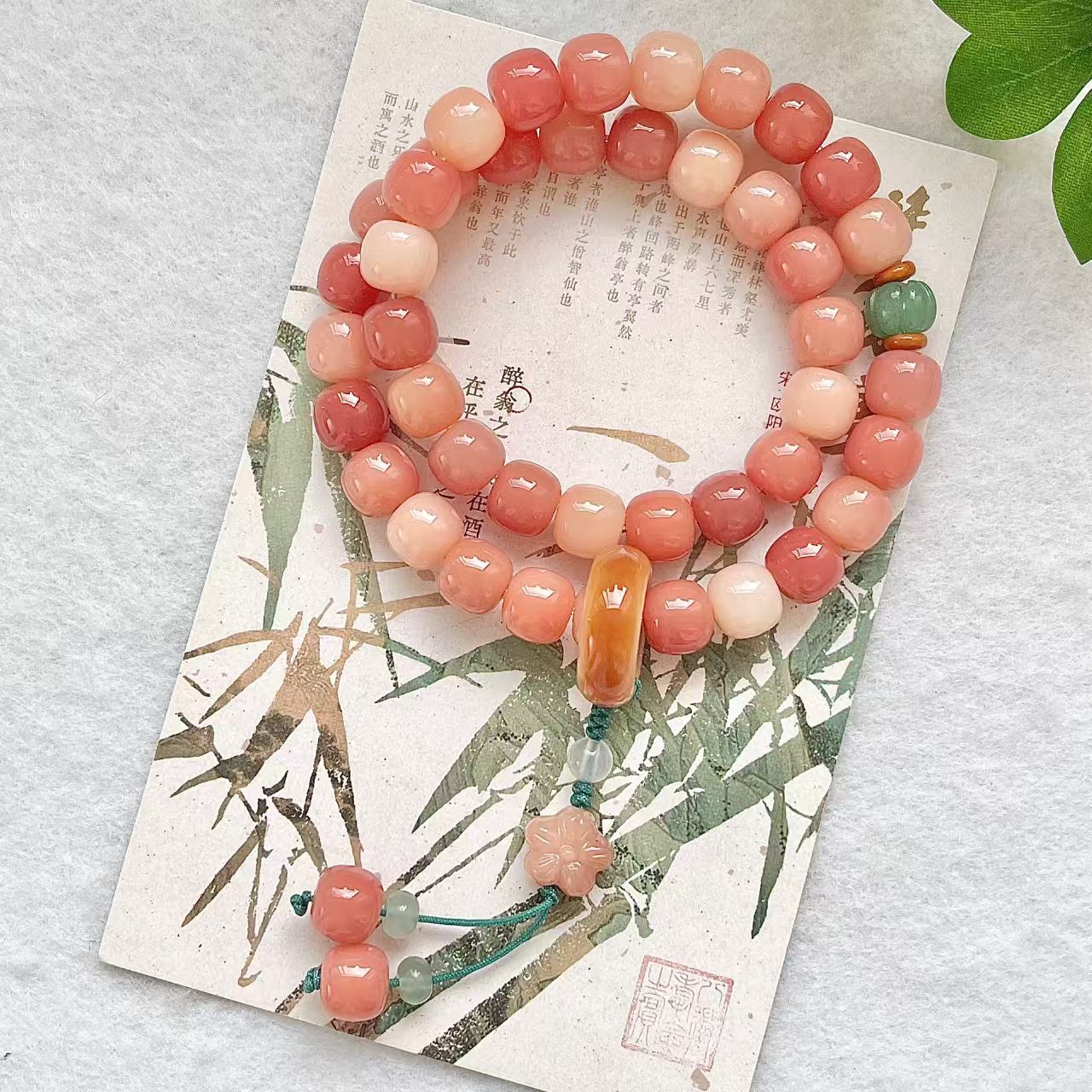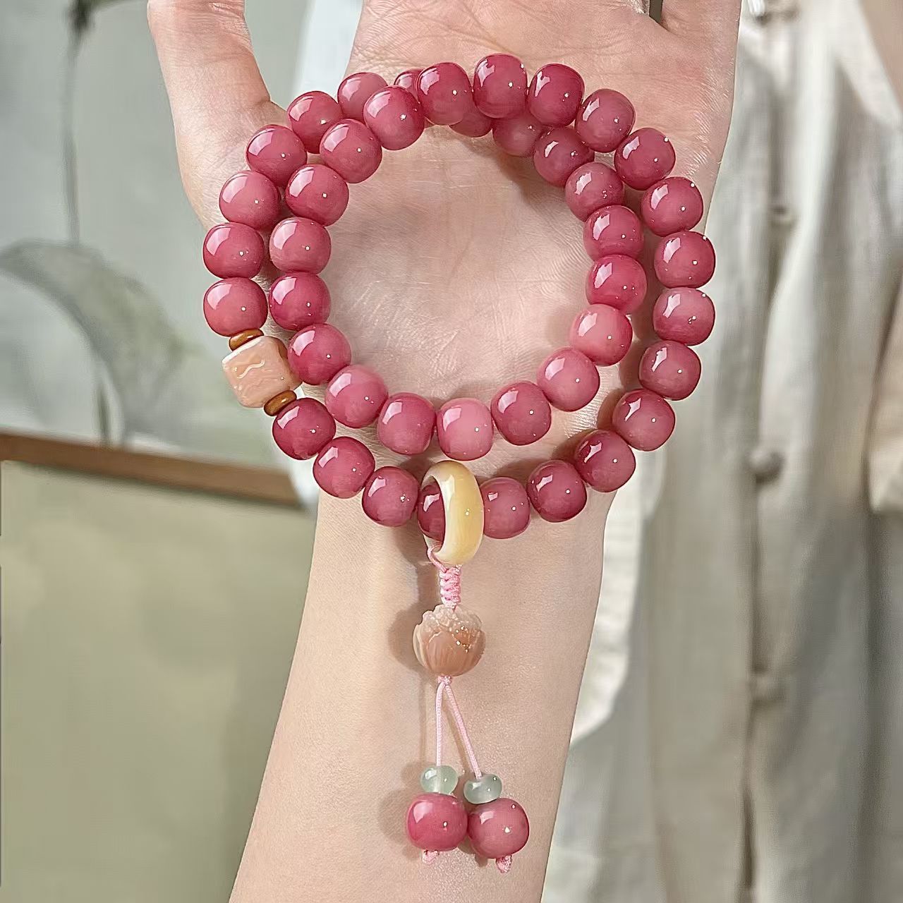 菩提珠(仏珠、数珠とも呼ばれる)は仏教文化の中で深い象徴的意義と精神的内包を担っており、その寓意は主に覚悟、知恵、修行と解脱を中心に展開され、具体的には以下のいくつかの方面から理解することができる: 核心的な意味 菩提覚悟「菩提」という言葉は、覚悟、知恵、覚醒を意味するサンスクリット語「Bodhi」に由来する。釈迦は菩提樹の下で悟りを証明して仏になったと伝えられているため、菩提珠は無明を打破し、真理に通じる境界を象徴している。菩提珠を身につけたり、持ったりすることは、修行者に心の目覚めを求めるように注意することです。 悩みを断ち切る 菩提珠の材質(多くは菩提樹の果実や種子)自体に天然のテクスチャがあり、衆生本有仏性を意味する。1粒のビーズをひねるごとに、1種の悩みを断ち切ることを代表して、特に108粒の制式は「百八の悩み」を打ち破ることを象徴している(仏教は人が108種類の根本的な悩みを持っていると考えている)。 精進する 計数ツール:念仏号を唱えたり、呪文を持ったり、禅を座ったりするとき、ビーズを動かして計数したりして、集中して、根気よく続けるのを助けます。 目覚まし法器:修行者に常に正念を保つように注意して、例えば『木槵子経』の言うように:“もし悩みを消そうとするならば、木槵子百八を貫いて、常に自分で身につけます。” 構造シンボル 108個: 最も一般的な制式で、「百八の悩み」に対応し、宇宙法則(例えば12ヶ月×9曜=108)を象徴する。 54/36/27: 108粒の半数または再分割のために、修行の難しさを簡略化し、順を追って漸進することを意味する。 母珠(仏頭): ブッダや修行のゴールを代表して、初心を忘れないように注意する。ひもはすべてのビーズを貫通し、「万法帰一」を象徴している。 スペーサービーズ/フリンジ: 装飾も表法であり、例えば流蘇喩「仏法は衆生を潤す」。 文化の延長の寓意 平安吉祥 民間信仰の中で、菩提珠は身を守るものとされ、邪気を払って災害を避け、無事に順調になる願いを託している。 心を静めて養う 仏教徒でなくても、菩提珠をひねることは情緒を安定させ、考えを沈殿させ、現代人のストレス解消の雅趣になることができる。 知恵を受け継ぐ 菩提珠は文化の記号として、仏教哲学と東方の知恵を乗せて、人々に慈悲の処世、明心見性を思い出させる